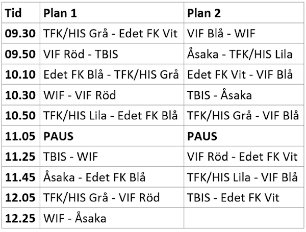 Här kommer söndagens spelschema. Vi samlas på Strömsvallen kl 8 för ombyte och uppsnack.