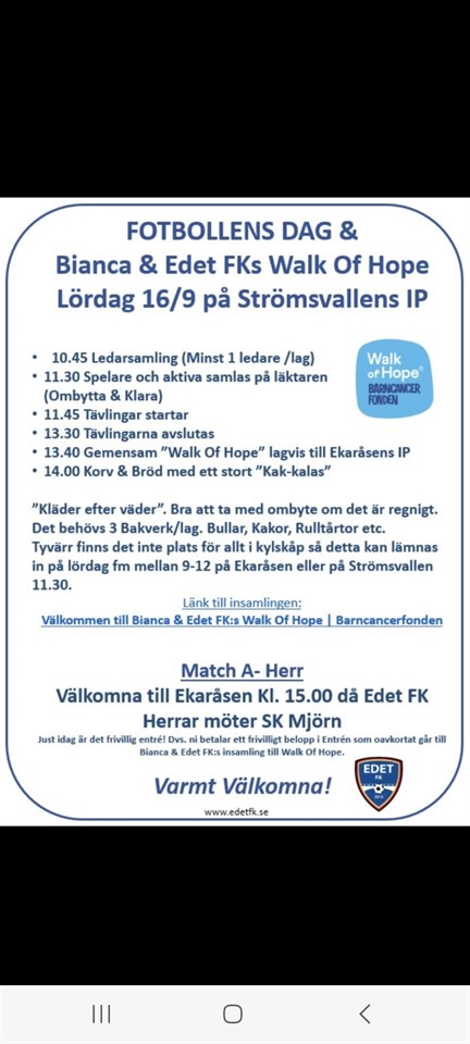 Lördagen den 16/9 Ă€r det dags för Fotbollens dag och Bianca & Edet FKs Walk of Hope. PĂ„ bifogad bild finns lite information om dagen. Hör av er till mig, Emma 0709129232, om ni har möjlighet att baka nĂ„got âœ