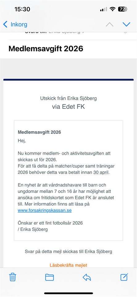 Klicka på bekräftelselänken i det mejl vi skickat dig för att börja ta emot uppdateringar från Edet FK P 13.