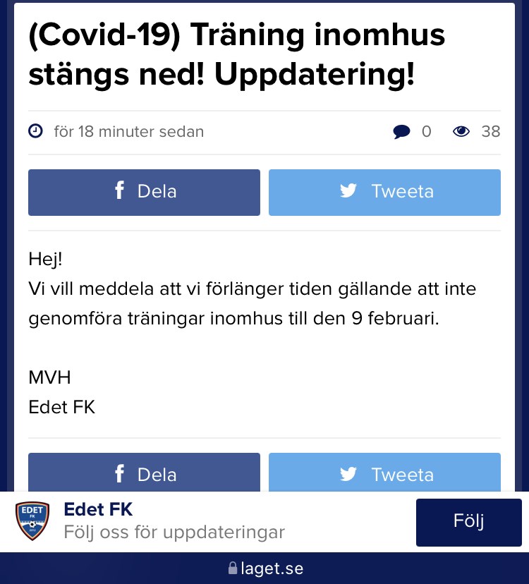 Hej! På grund av den dramatiska smittspridningen just nu där vi har ett antal konstaterade smittade både bland aktiva spelare & ledare i föreningen så har styrelsen under söndagskvällen tagit ett snabbt beslut om att ställa in alla inomhusaktiviteter från och med idag Måndag 17/1. Detta kommer att preliminärt gälla två veckor framåt men kan förlängas beroende på hur smittläget ser ut då. Samtliga ledare är redan nu informerade om detta beslut. Vi kommer i största möjliga mån hjälpa till att hitta träningstid ute för respektive lag. Vi hoppas på er fulla förståelse kring detta beslut. Styrelsen Edet FK ------------ ---------------- -------------- ---------------- För övrigt gäller följande: - Stanna hemma om du känner minsta tendens till att bli sjuk. - Om någon annan i hushållet har covid får man inte under minst 7 dagar delta i någon aktivitet ,då det är hemmakarantän som gäller. - Förlägg aktiviteten utomhus. - Testa dig på närmaste vårdcentral vid sjukdomssymptom. Stanna hemma tills du fått svar på ditt Covid test. - Vi bör avstå från att ordna eller delta i läger, cuper eller andra större aktiviteter inomhus med deltagare som vanligtvis inte samlas. Enstaka aktiviteter, matcher och endagstävlingar, av typen seriespel eller motsvarande kan dock genomföras. - Håll avstånd med 1-1,5m till annan person. - Tvätta händerna ofta, sprita händerna om det finns. - Dela inte vattenflaskor, visselpipor eller annan utrustning. - Planera för att bedriva verksamhet i grupper med begränsat antal personer exempelvis lag eller motsvarande samt att dessa inte blandas med varandra mer än vad aktiviteten kräver. - Begränsa antalet besökare som till exempel vårdnadshavare i så stor utsträckning som möjligt. - Personer i en eventuell publik har ett eget ansvar att följa Folkhälsomyndighetens föreskrifter, allmänna råd och rekommendationer. - Idrottsföreningar och utövare ska fortsatt vidta åtgärder för att undvika smittspridning av covid-19 beaktande Folkhälsomyndighetens allmänna råd. /Edet FK/ P 09/10 17 jan 2022 1kommentar