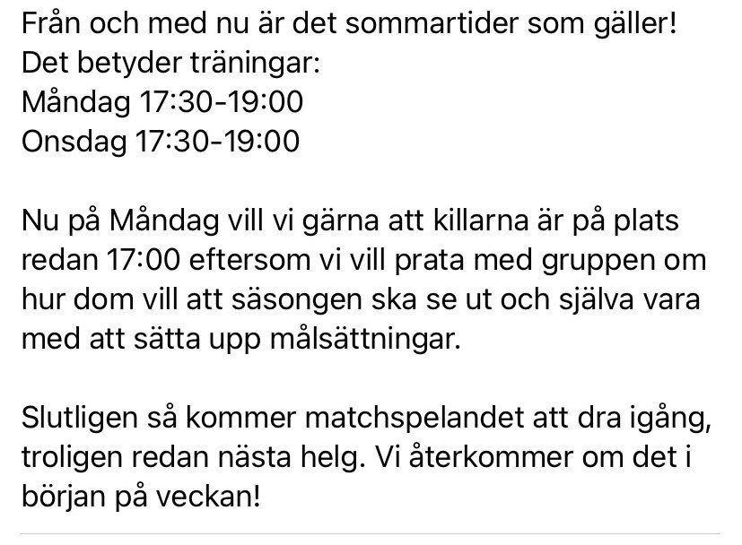 Vintertiderna gäller fortfarande: Måndag inne 18:30-19:30. Onsdag och Fredag ute 17:30-19:00. Sommartiderna får vi först när kommunens gräsplaner är spelbara. Återkommer här på lagetsidan när tiderna ändras. Vi tänkte ändå ha en vårkickoff denna vecka där vi verkligen önskar att så många barn som möjligt kan komma. Ni kommer att få en kallelse på mail som vi vill att ni svarar på även om man inte tänker delta. Får ni inte kallelsen hör ni av er så fort som möjligt då det är superviktigt att den fungerar inför kommande spelår!!! Vi vill även att ni hör av er ifall ni inte kan komma på våra träningar. // Tränarna P 09/10 12 apr 2021 5kommentarer