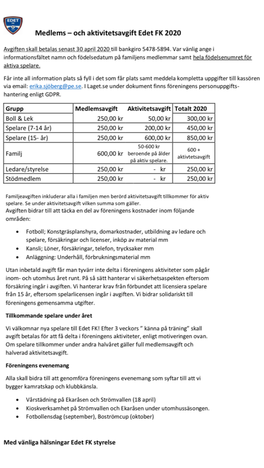 Det är dax att betala medlemsavgiften för 2020. Sista betaldatum är den 30/4. Finns det frågor är det kassör Erika som kan svara på dem: Erika.sjoberg@pe.se Eller 0708-960148 efter kl 18 P 09/10 16 mar 2020 0kommentarer