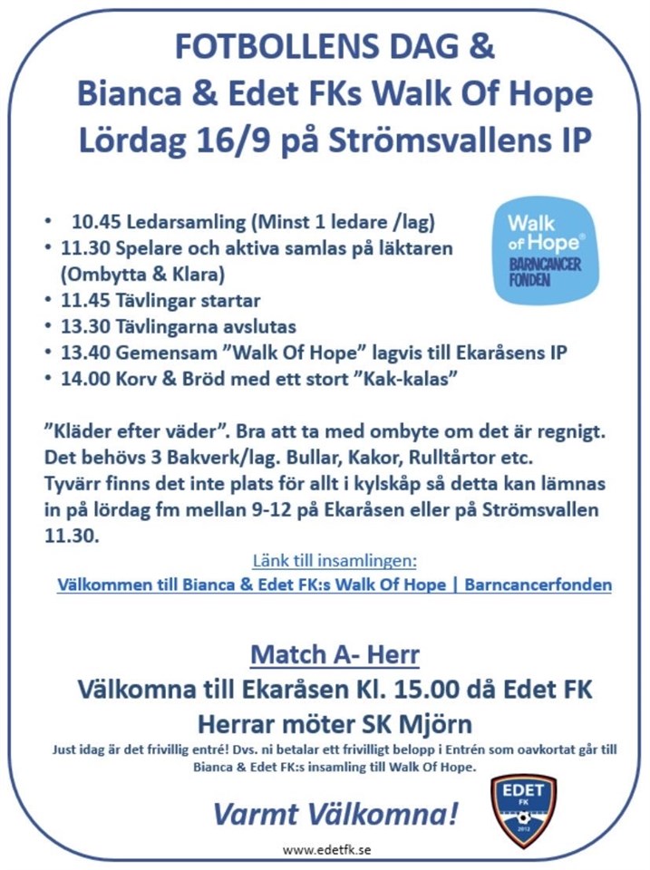 16/9 är det dags för årets Fotbollens dag & Walk of hope. Vi behöver 3 föräldrar som kan tänka sig att baka något gott. Anmäl er här eller direkt till en ledare. P 09/10 5 sep 2023 5kommentarer