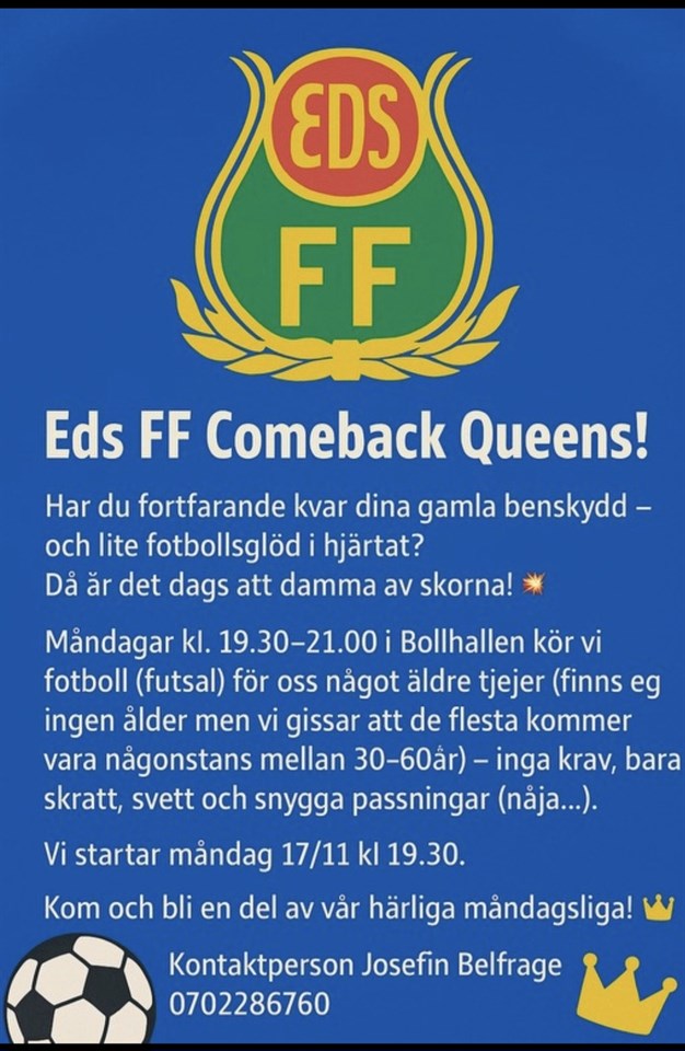 Måndagar kl. 19.30–21.00 i Bollhallen kör vi fotboll (futsal) för oss något äldre tjejer (finns eg ingen ålder men vi gissar att de flesta kommer vara någonstans mellan 30-65 år) – inga krav, bara skratt, svett och snygga passningar (nåja…).