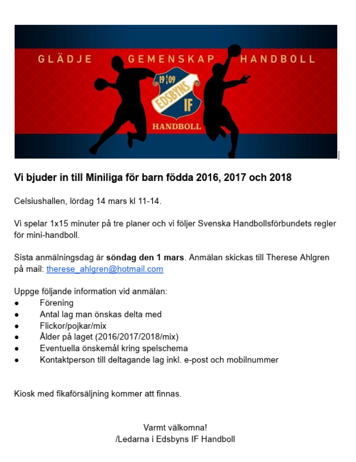 Klicka på bekräftelselänken i det mejl vi skickat dig för att börja ta emot uppdateringar från Edsbyns IF HF U8 Född 17/18.
