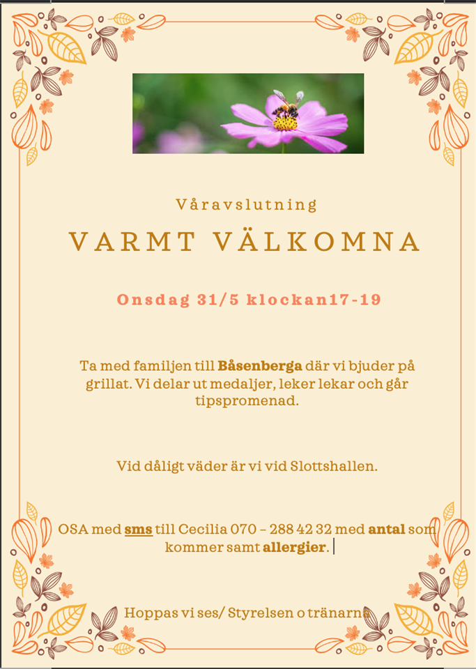 Hej Vi bjuder in alla barn med familjer på en avslutningsfest i Båsenberga (Lilla backen) Se inbjudan och glöm inte att OSA med ett SMS till Cicci senast 26/5 Hoppas vi ses/ Styrelsen Ekbackskyrkans IBK 15 maj 2023 0kommentarer