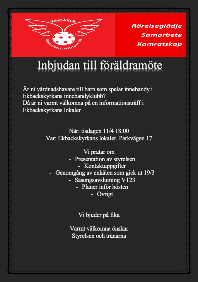 Vid klubbens årsmöte valdes en ny styrelse och en ny ordförande i klubben. Nya ledamöter är Linda Ohlsson, Louise Rundqvist, och Jessica Ohlsson Bergström. Kvarstående ledamöter är Cecilia Larsson, Bo Hammar, Pär Lindar och Olle Olsson. Årsmötet beslutade också att hållla tre platser vakanta i styrelsen för representanter från övriga lag och föräldrar. Vilket vi hoppas snart kan fyllas. Tobias Englund heter klubbens nye ordförande. Han är assisterande tränare i 10-12 laget. Han flyttade till Vingåker när han var 19 år, men är uppväxt i Kopparberg. Hans far och hans familj är dock från Vingåker så flytten var inte så svår. Till vardags åker han runt i Sörmland och Östergötland och kontrollerad svetsfogar mm i företaget Dekras regi. I och ned nyvalet så avgick Olle Olsson som ordförande. Ett stort tack till honom och den stora insats han gjort för klubben. Administrativa uppgifter Eftersom klubben gått med underskott det senaste året har vi bedömt att vi inte kan arvodera någon för de administrativa uppgifterna. Styrelsen måste därför inom sig fördela ansvar och uppgifter Ekbackskyrkans IBK 3 mar 2023 0kommentarer