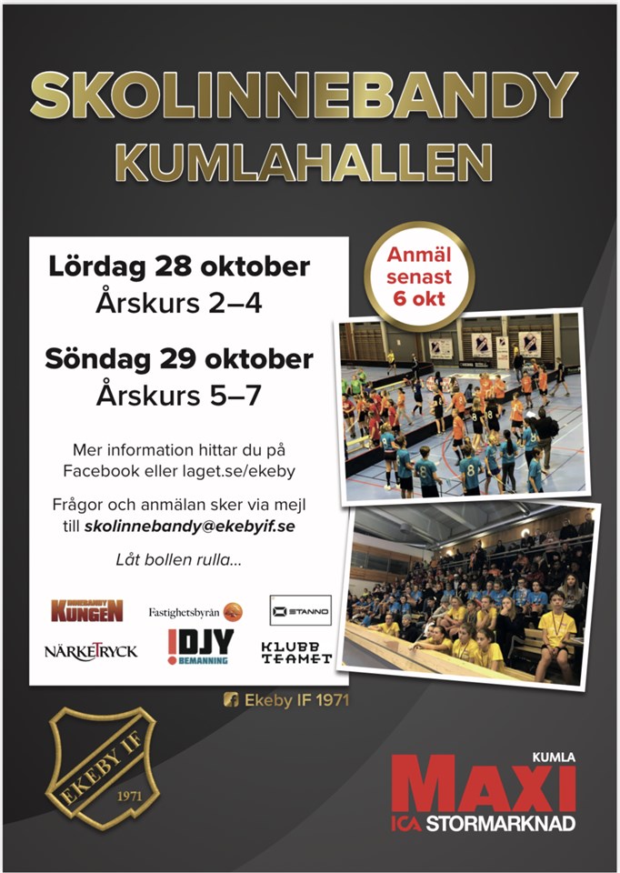 Ekeby IF arrangerar Skolinnebandy 2023 Den 28-29 oktober är det Skolinnebandy för elever i årskurs 2–4 och 5–7. Lördag 28/10 årskurs 2-4 Söndag 29/10 årskurs 5-7 Vi spelar 4 - 4 på liten plan och mixade lag som gäller. Vi spelar på tre planer samtidigt i Kumlahallen. Med mixade lag menar vi att det ska vara både killar och tjejer som spelar samtidigt. Det ska vara MINST en vuxen med som ledare, förälder eller lärare. Det är bara tillåtet att deltaga med rena klasslag! Några vanliga funderingar och frågor vi får är: Kostnad? – Alla lag måste betala 60kr/barn. Betalning sker till: Plusgiro 794328-5 eller Swish 123 694 61 31. Kom ihåg att märka för vem betalningen gäller (VIKTIGT!) Betalningen sker lagvis för alla lagdeltagare. Detta ska kunna visas upp på plats. Tröjor? – Alla ska ha hämtat ut sina tröjor senast torsdagen innan arrangemanget. Resultat? – Alla resultat läggs upp via cuponline.se sök efter Skolinnebandy 2023 Prisutdelning? – Vi har prisutdelning när alla matcher i årskurs 2-4är klara, ca 16.30 på lördagen. Vi har prisutdelning när alla matcher i årskurs 5-7 är klara, ca 16.30 på söndagen. Måste vi vänta kvar för prisutdelning? – Ja, priser presenteras på plats. All info till vinnande lag sker på plats efter placeringsmatcher. Arrangemang? – Det finns cafeteria, sjukvårdsvärdar, entrévärdar, sarg/planvärdar och även sekretariat. Vi har tävlingsansvariga på plats under hela eventet. Detta är ett event skapat för barn och det viktiga är INTE att vinna. Priser? – Det kommer att finnas olika priser, dels kan ett lag i varje åldersgrupp vinna sin serie, dels finns ett Fair Play-pris. Fair Play-priset är ett biobesök för hela klassen, 25 elever plus lärare, vid angivet datum i december på Kumla Folkets hus. Fair Play-priset vinns av det lag som röstas fram av deltagande lag och domarna. Alla lag har varsin röst och man röstar på det motståndarlag som man tycker har spelat sjystast och mest rättvist. Domarna har även en röst vid ett lika resultat Det kan vara samma lag som vinner både serien och Fair Play-priset. Det kan även vara olika lag. Priset går till hela den klassen som vinner. Prisutdelning sker samtidigt till alla barn i Kumlahallen. Alla klasseri årskurs 2–4 får en pokal, och egen t-shirt. Alla deltagare i årskurs 5–7 får en egen t-shirt. Ansvarig vuxen? – Det måste finnas minst en ansvarig förälder med på plats under hela arrangemanget. Matchstart? – Matcherna startar vid givet klockslag, oavsett om bägge lagen är på plats eller ej. OBS! Glöm ej att ställa om till vintertid. Alla matcher spelas i Kumlahallen. Viahallen – stora hallen Vissberga – gamla badet Byrsta – glashallen rakt in vid entrén. Övriga frågor? Måste vi ha ett mixat lag (både tjejer/killar)? – Ja, det måste vara mixade lag! Har vi möjlighet att förvara väskor och ombyte på plats? – Ja, det finns möjlighet att förvara kläder och annat på plats. Vi ansvarar dock ej för något. Hur gör vi med värdesaker? – Vi har ett rum för förvarning, men det är på eget ansvar. Finns det försäkring med i anmälan? – Nej, Ekeby IF frånsäger sig allt ansvar för eventuella skador, trasig utrustning eller personskada. Kumla kommun har dock en bra försäkring för skolbarn, se efter vad som gäller för just dig. Finns det mat att köpa i cafeterian? – Ja, smörgåsar, hamburgare, sallad, korv med bröd, frukt, godis mm. Antingen betalar du kontant, eller så swishar du. Hur ser schemat ut? – Spelschemat gör vi när anmälningstiden är slut. Vill du ha schemat till ytterligare mejl? Skriv till skolinnebandy@ekebyif.se Ekeby IF-1971 En stad-en dröm-en klubb!