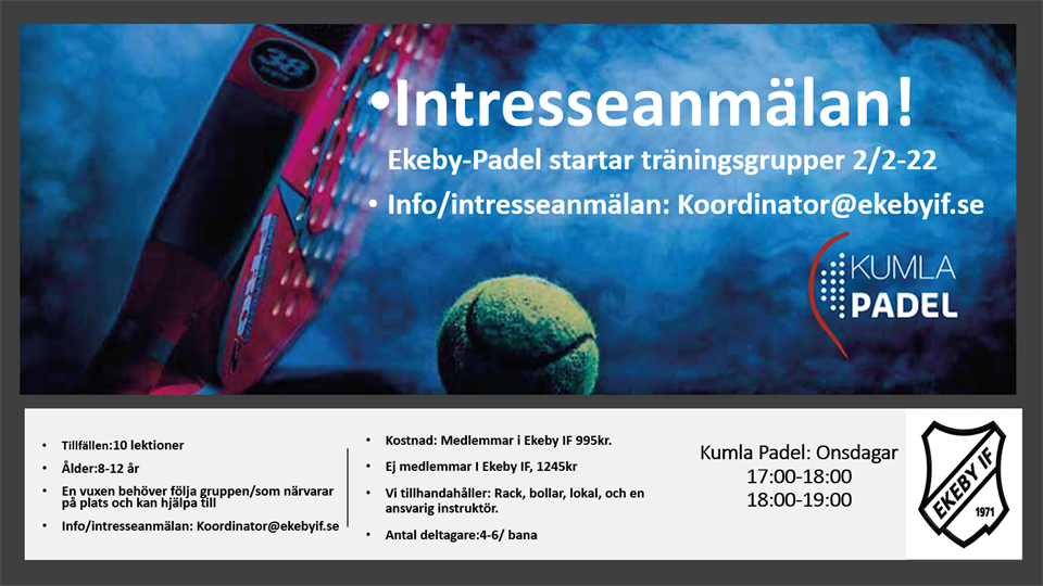 Intresseanmälan! Ekeby Padel startar träningsgrupper 2/2-22 För intresse anmälan maila Koordinator@ekebyif.se Var: Kumla Padel När Onsdagar 17:00-18:00 och 18:00-19:00 Ålder: 8-12 år, vi kommer att nivåanpassa grupperna. Varje grupp blir mellan 4-6 deltagare Pris: Medlemmar Ekeby IF 995kr/10 tillfällen, icke medlemmar 1245kr /10 tillfällen Det är en instruktör med från Kumla Padel, vi kommer behöva ha någon vuxen/ledare med varje pass. Hen som blir med, kommer få hjälpa till på plats. Det finns rack, bollar att låna på plats. Skicka in din intresseanmälan, vi återkommer med hur många grupper vi kan starta upp. Vad behöver jag maila för uppgifter: Namn på barnet personnummer Namn på en förälder Personnummer En epost adress som används Ett mobilnummer. Varmt välkomna.