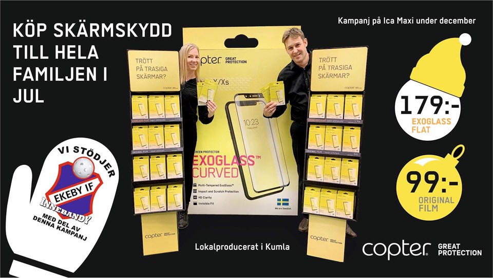 Ekeby IF presenterar en ny samarbetspartner FASHIONTEKK AB! Just nu rullar fashiontekk igång en kampanj på samtliga ICA Maxi butiker i Sverige. Det är en kampanj med copter glas. Just nu kan du som kund hos ICA välja att köpa Copter glas till din mobiltelefon, och samtidigt bidra/stötta Ekeby IF! Via detta samarbete vi inlett kommer föreningen att få ta del av denna kampanj! Köp den perfekta julklappen Till barnens mobiltelefon! Safety first! Låt glasen köpas hos ICA Maxi