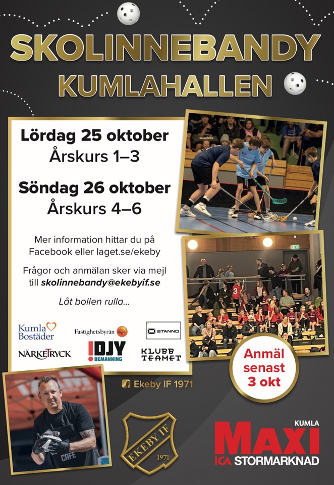 Vi skickar givetvis ut inbjudan via skolorna, men det går redan nu bra att anmäla sitt lag/klass till årets största event för barn och ungdomar i Kumla kommun. Eventet sker i samarbete med ICA Maxi Kumla, och Ekeby IF arrangerar Skolinnebandy för trettonde året i rad! 📅 Den 25–26 oktober spelas Skolinnebandyn för elever i årskurs 1–3 och 4–6. • Lördag 25/10: årskurs 1–3 • Söndag 26/10: årskurs 4–6 Vi spelar 4 mot 4 på liten plan och med mixade lag – både tjejer och killar spelar samtidigt. Matcherna spelas på tre planer parallellt i Kumlahallen. Varje lag måste ha minst en vuxen med som ledare, förälder eller lärare. 👉 Anmäl senast 3 oktober! Endast rena klasslag får delta. ? Vanliga frågor Kostnad Alla lag betalar 60 kr/barn. Betalning sker till Plusgiro 794328-5 eller Swish 123 694 61 31. Märk betalningen med lag/klass (viktigt!). Betalning sker lagvis och ska kunna visas upp på plats. Tröjor Alla deltagare ska ha hämtat ut sina tröjor senast torsdag 23 oktober. Storlekar: 116, 128, 140, 152, 164, S, M, L, XL osv. Resultat Alla resultat publiceras på cuponline.se – sök efter Skolinnebandy 2025. Prisutdelning • Årskurs 1–3: lördag ca kl. 17.00 • Årskurs 4–6: söndag ca kl. 17.00 Alla priser delas ut på plats. Arrangemang På plats finns cafeteria, sjukvårdsvärdar, entrévärdar, planvärdar, sekretariat och tävlingsansvariga. Detta är ett barnarrangemang – det viktiga är inte att vinna! Priser Det delas ut priser till vinnande lag i varje åldersgrupp samt ett Fair Play-pris. Fair Play-priset är ett biobesök för hela klassen (25 elever + lärare) på Kumla Folkets hus i december. Priset röstas fram av deltagande lag och domare. Alla lag i årskurs 1–3 får pokal och t-shirt. Alla deltagare i årskurs 4–6 får en egen t-shirt. Ansvarig vuxen Det måste alltid finnas minst en ansvarig förälder/lärare med under hela arrangemanget. Matchstart Matcher startar på utsatt tid, oavsett om båda lagen är på plats. Spelplatser Kumlahallen, Viahallen (stora hallen), Vissberga (gamla badet), Byrsta (glashallen vid entrén). Övrigt • Lag måste vara mixade (både tjejer och killar). • Förvaring finns på plats, men på eget ansvar. • Ingen försäkring ingår via Ekeby IF, kontrollera skolans försäkring. • Cafeterian erbjuder smörgåsar, hamburgare, sallad, korv, frukt, godis m.m. Betalning kontant eller via Swish. • Spelschema skickas ut efter att anmälningstiden gått ut. Mejla skolinnebandy@ekebyif.se eller koordinator@ekebyif.se om du vill få det till fler adresser. // Magnus C, Klubbchef Ekeby IF