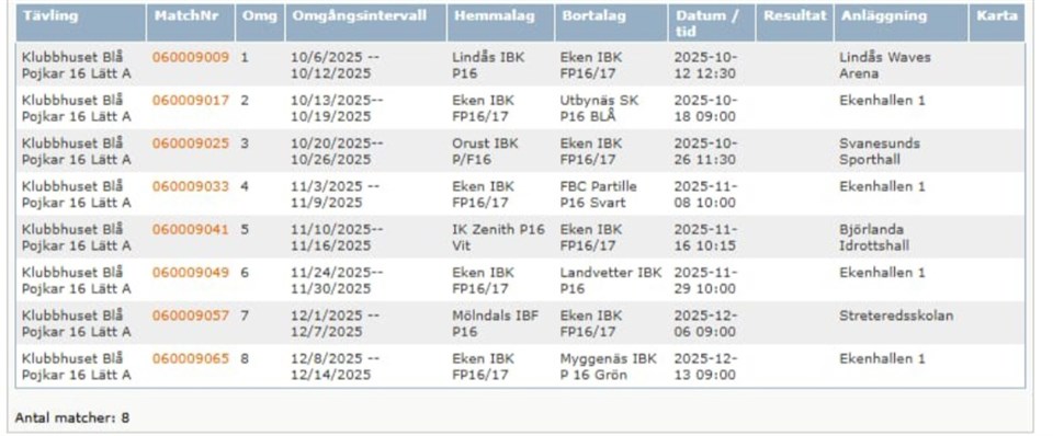 | FBC Partille P16 Svart (hemma) | 8 nov, 10:00 |