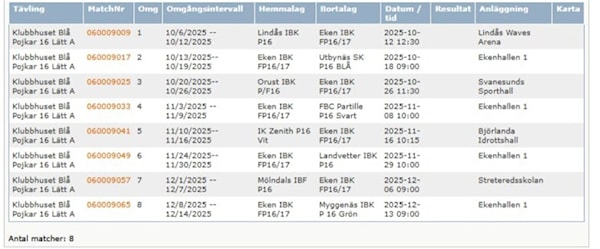 | FBC Partille P16 Svart (hemma) | 8 nov, 10:00 |