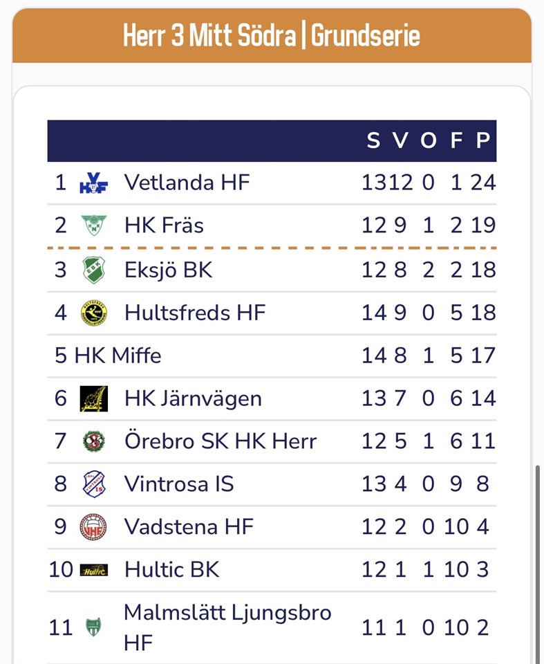 | 7. | (8) | Jönköpings IK Utveckling Akademi Herrar |
