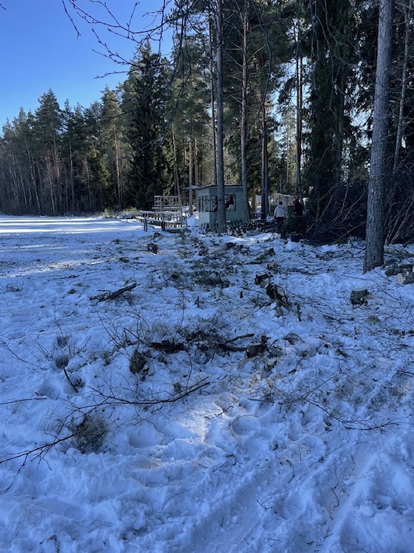 Nu har vi äntligen kommit igång med att fälla träden för den nya testbryggan för ev flytt av banans läge i sjön.