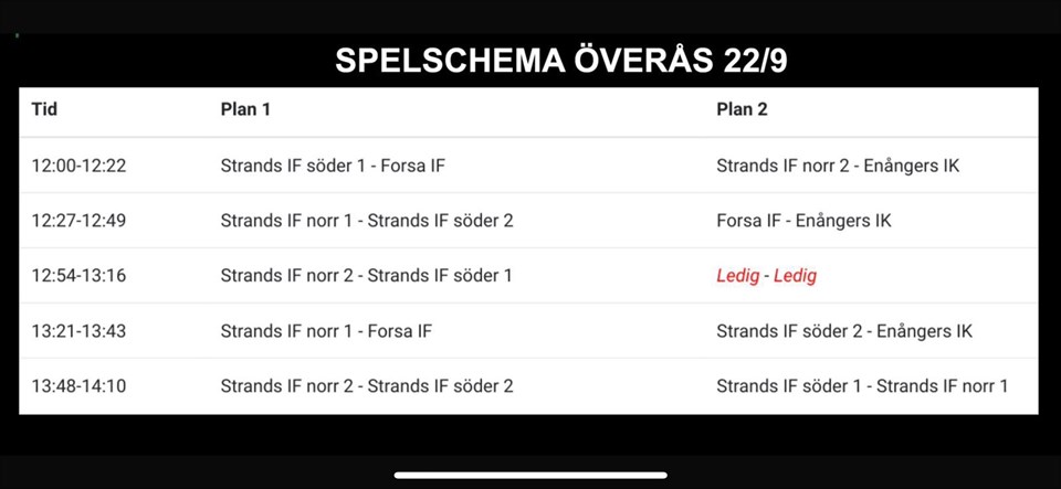 Hög har fått lite andra tider och bara en plan tillgänglig på lördag. Nu spelar lagen 1 längre match 2x18 istället för 2 kortare. Samling för alla 10.15 ute i Hög, så hejar vi på varandra. (Vi skickar ut en kallelse för samlingen, bekräfta att ni sett den tack 😊) Match 1 börjar 10.45 och match 2 ca 11.20. Match 1 Match 2 Noah Emil Max Jaxon Matteo Jocke Henny Olle Elina Eddie Loui Jamie Isac Gunnar Sebbe Målvakt i båda. Mix 17/18 7 aug 2024 0kommentarer