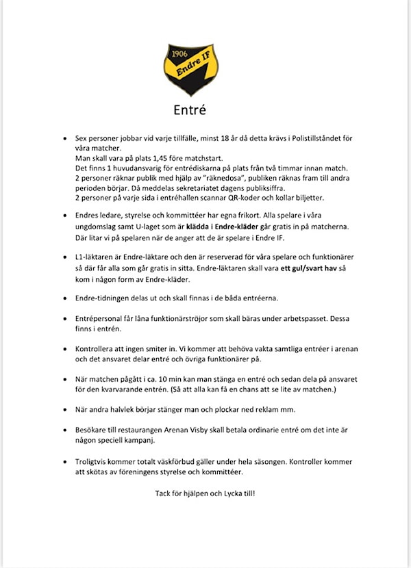 Då är det dags för oss att vara entréansvariga på söndagens match. Kul att många anmält att de kan hjälpa till. På plats kommer ni ha hjälp av Nils Gardell, Jonas Persson och Eric Klosterdal som är rutinerade entrévärdar.