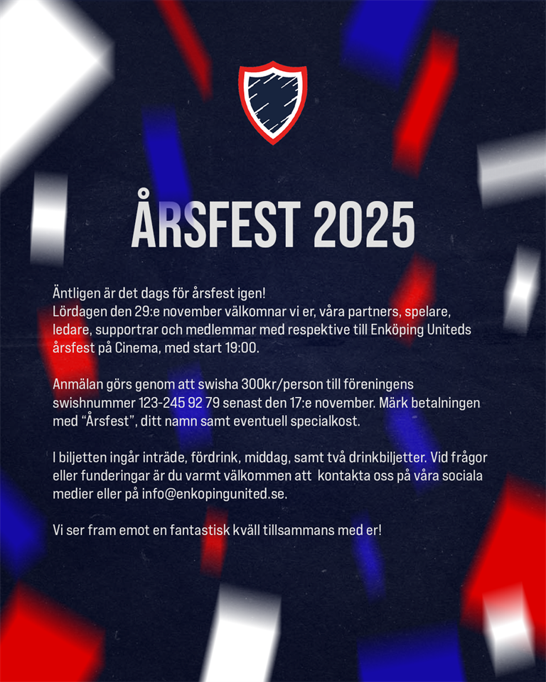 Lördagen den 29:e november välkomnar vi alla våra spelare, ledare, partners, supportrar och medlemmar med respektive till Enköping Uniteds årsfest på Cinema.