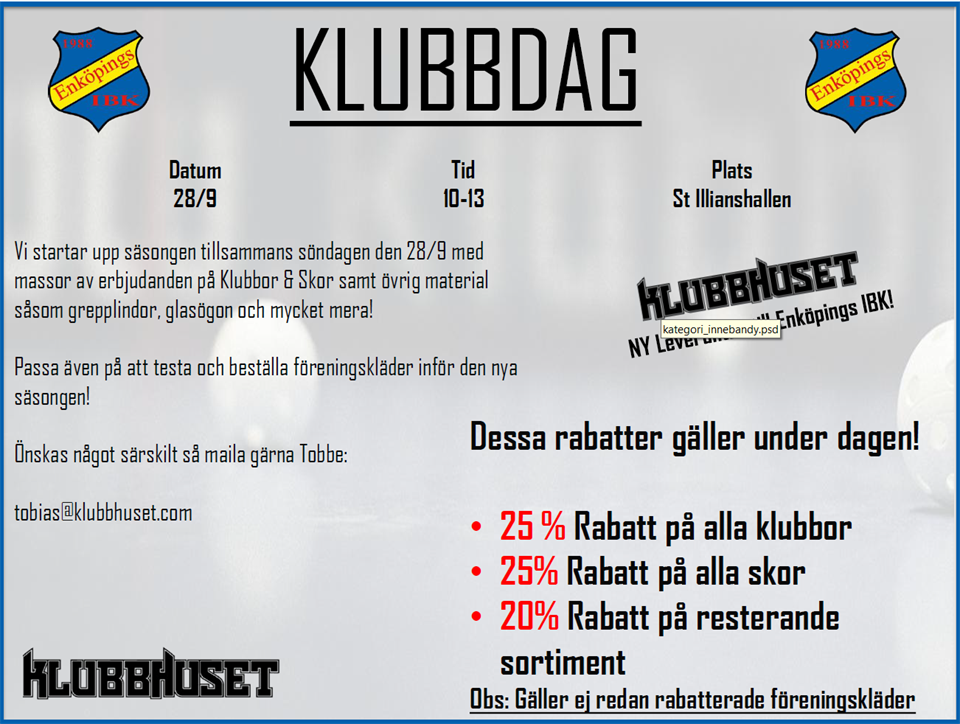 Hej. I år har styrelsen, tillsammans med medlemmarna på årsmötet beslutat att varje spelare ska bidra till föreningen genom att sälja; 3 st Klubbrabatthäften 3 st Adventskalendrar 10 st Bingolotter Igår fick jag tilldelat klubbrabatthäftena som jag kommer börja dela ut på fredag den 12/9 till föräldrarna. Priset är 250kr/häfte. Minimum 3 häften/spelare ska säljas (Gärna fler!) och förtjänsten går till föreningen EIBK. Häftet säljs både som fysiskt och digitalt. När man köper ett häfte för Enköping får man även tillgång till rabatter i andra städer, tex Västerås och Uppsala. Instruktion för betalning av klubbrabatten finns i häfte. Redovisning av köpt häfte gör ni som så att ni skickar en skärmdump på erhållet kvitto som ni får i sms-form samt med spelarnamn. Det skickar ni till mig på nr 070-917 06 82. Så kan jag i min tur redovisa till föreningen avseende vårat lag sålda klubbrabatthäften. / Sabina Lindberg P 15/16 9 sep 0kommentarer