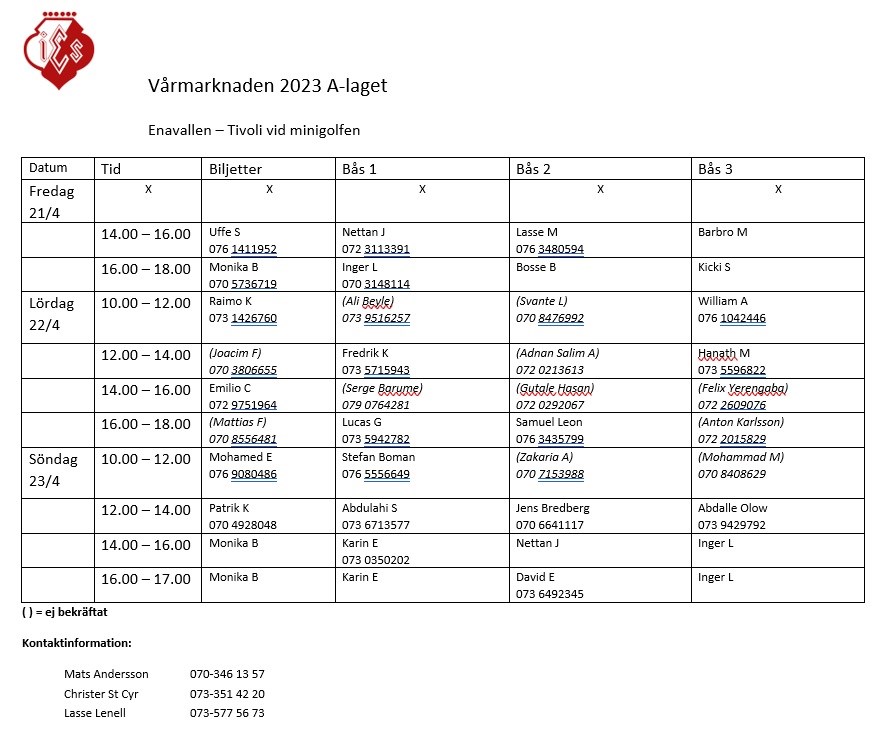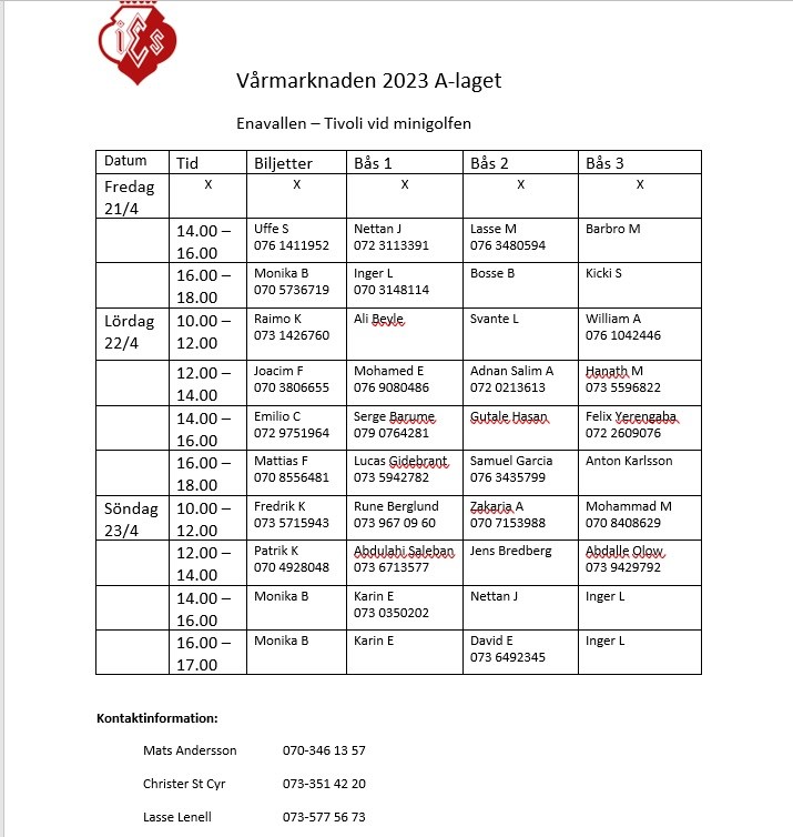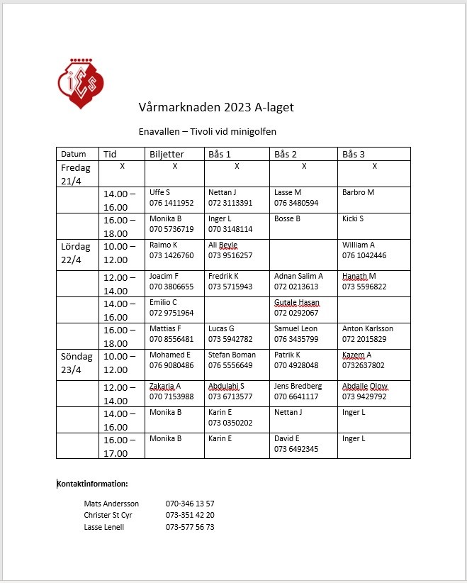 Slutgiltigt schema för vårmarknaden, kontrollera era tider. Kom 10 minuter innan utsatt tid. Det finns 3 lediga tider under lördagen. Om någon kan/vill ta ett extra arbetspass, meddela Christer på 0733 514220, så utgår en bonus på 200 kr. /Styrelsen