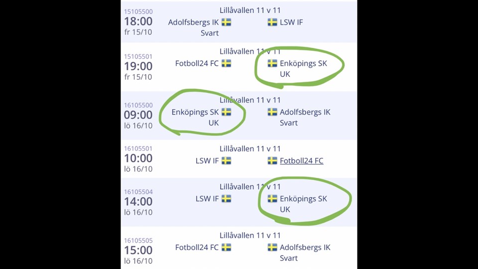 Hej! Nu har samtliga tider fastställts. Ni kommer få hjälp vid öppning/stängning och all nödvändig info innan ni påbörjar ert pass. Ni behöver bara komma med ett leende och lite arbetssugna. Det kommer vara härligt mycket folk på Enavallens fina planer, så försäljningsmöjligheterna är förstås stora i helgen. Om jag räknar rätt så är det 16 st hemmamatcher under dessa två dagar på Enavallen. Lördag: 10:30-11:30 Johannes, Ville. 11:30-13:00 Abdi-Malik, Adi. 13:00-14:30 Ivar, Lucas. 14:30-16:00 Marcus, Ahmed. 16:00-18:00 Elias, Luqmaan. Söndag: 11:00-12:30 Samuel, Elmi. 12:30-14:00 Anton, Olle. 14:00-16:00 JB, M Ali. Ni får gärna kommentera med ett enkelt "ok" här nere, det bekräftar att ni har info om just eran tid/dag och att ni förstår all information. Ni som ej har bekräftat återkommer vi till i god tid innan helgen med info.