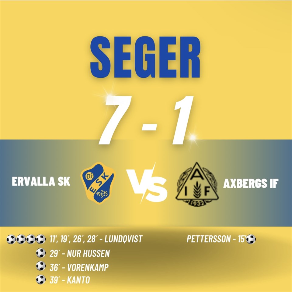 Ervalla SK - Axbergs IF 7-1 (2-1) 1-0 Filip Lundqvist (Kanto) 1-1 Carl Pettersson (AIF) 2-1 Filip Lundqvist (Kanto) 3-1 Filip Lundqvist (Kanto) 4-1 Filip Lundqvist (Sörman) 5-1 Abdi Nur Hussen (Ruzdi) 6-1 Chris Vorenkamp 7-1 David Kanto (Burman) Herrar 14 nov 2022 0kommentarer