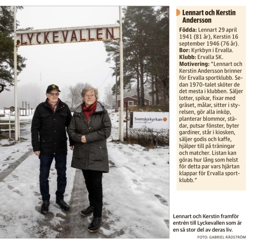 Idag blev det officiellt att Ervalla SKs eldsjälar Lennart Andersson med frun Kerstin Andersson är nominerade till länets idrottsgala den 15/2 på Conventum. Vi är så klart stolta och glada över nomineringen och kommer hålla alla tummar och tår för att utmärkelsen skall tillfalla Lennart och Kerstin. Sen är nomineringen i sig oerhört stort och smickrande självfallet och på kvällen den 15/2 har vi svaret. Återigen väldigt roligt och glädjande att Ervalla SK ännu en gång sätts på kartan, denna gången via mångårigt engagemang i vått och torrt av Kerstin och Lennart. Vi gratulerar de båda till nomineringen och ser fram emot en historisk galakväll när länets idrottare och dess ledare skall hyllas för första gången genom en alldeles egen "idrottsfest". Herrar 19 jan 2023 0kommentarer