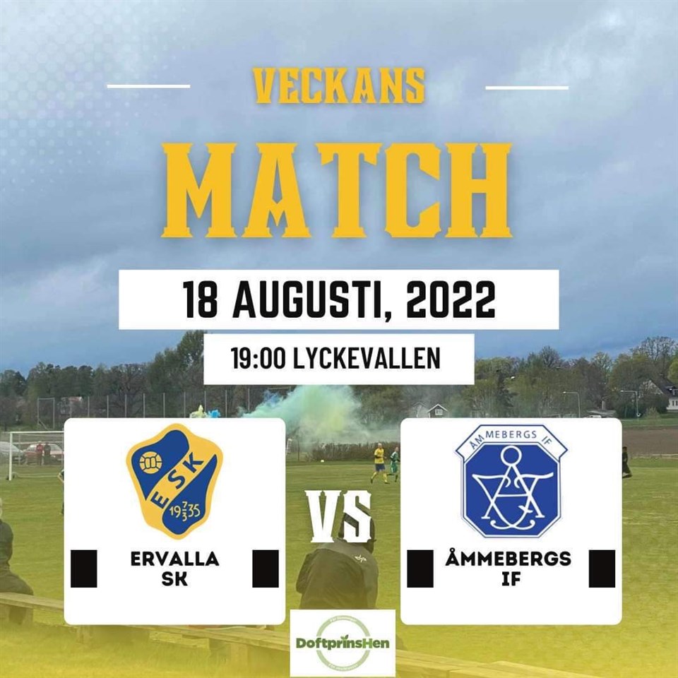 På torsdag vankas det hemmamatch igen, det var ju ett tag sen sist vi hade länets sexa på besök på Lycke. Bygden gästas av Åmmebergs IF som innehar topp tre platsen som idagsläget innebär positivt kval mot div.5 laget Lillåns FK i dubbelmöte (just nu alltså). I våras på Allévallens konstgräs vann ÅIF med 2-1 i en jämn tillställning där hemmalaget gick segrande ur kampen. Upp till kamp för revanch och hemma på natursköna Lyckevallen vill vi ju gärna att poängen blir kvar. Senast mot Lillkyrka i söndags blev vi det första laget i serien att ta alla poängen med hem från Kärsta IP, hemmalaget var obesegrade hemma men har haft det tuffare i bortaspelet. Inga avstängda spelare till denna omgång, dock några ännu på resande fot men till nästa omgång skall truppen vara så när som komplett igen. Torsdag 18/8 kl 19:00, Omg 10. Ervalla SK - Åmmebergs IF Lyckevallen, Ervalla Matchvärd; Doftprinshen Varmt välkomna till en spännande match. Herrar 16 aug 2022 0kommentarer