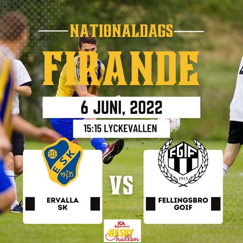 Imorgon måndag vankas det hemmamatch igen på Lyckevallen. Fellingsbro GoIF kommer på besök på em för att avverka omgång no7 i årets länssexa. Två lag som kommer revanschsugna till det traditionstyngda firandet, förlust senast för båda gängen i tider av stundent och diverse skolavslutningar / examens. Under 2000-talet har vi endast fått ställa in ett firande oavsett division vi spelat i eller om det varit ungdomslag som spelat match den 6/6 och det var 2020 pga pandemin. Ifjol släppte restriktionerna precis lagom till nationaldagen och då bokades det in en vänskapsmatch lite snabbt. Vi finns på arenan från kl 14:00 och 15:12 ställer lagen upp sig för nationalsång framförd av Ulf Helmer som varit trogen uppdraget bortsett en gång under alla år pga förhinder och då fick Jenny Wåhlander rycka in. 15:15 drar sen norrderbyt igång och för åskådarna väntas kiosken, lotterier och grillen. Bäst av allt, frivillig entrépeng denna säsongen som du bestämmer själv vad du väljer att swicha bygdens sportklubb. ESKs swish för dig från soffan som också vill stötta vårt arbete dag in och dag ut för en mer levande bygd; 123 4717 815 Väl mött imorgon på "bygdens nöjesfält" Ervalla SK - Fellingsbro GoIF Omg.7, länsssexan Kickoff 15:15 men kom itid för nationalsång Domare; Christer Johansson Matchvärd; ICA Näsbyhallen, Frövi