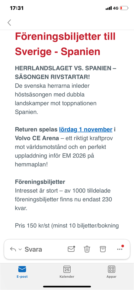 1 November Sverige-Spanien, 150 kr, se bild.