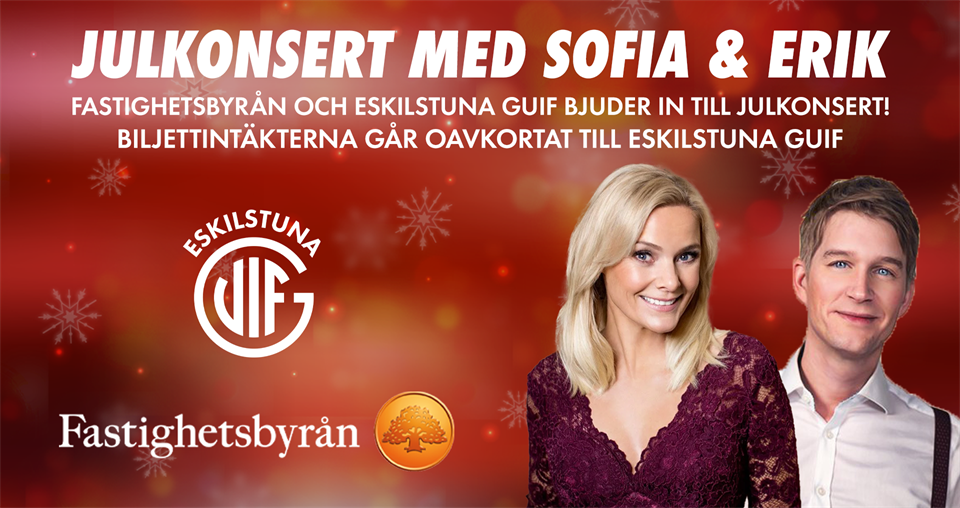 Fastighetsbyrån och Eskilstuna Guif bjuder in till en stämningsfull julkonsert med Sofia & Erik – en kväll fylld av värme, musik och gemenskap där alla biljettintäkter går oavkortat till Eskilstuna Guif IF.