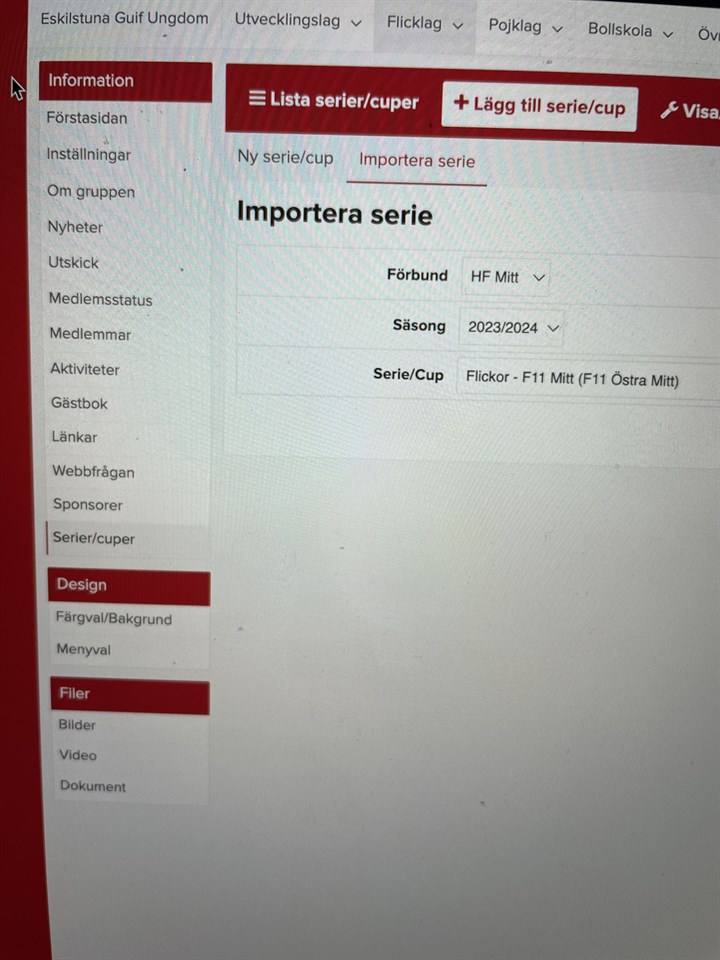 För de flesta lag som ska spela seriespel finns nu möjlighet att ladda in seriematcherna till sina laget.se kalendrar, genom funktionen importera serie, se bild. Önskar ni hjälp med det, så bara att ni hör av er med vilket lag och serie det gäller! Mvh Lars