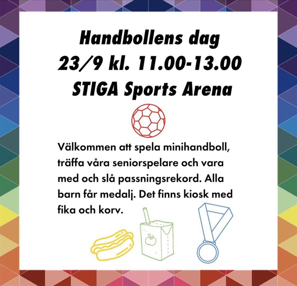Välkommen till Handbollens dag i Stiga Sports Arena lördag 23/9 kl 11-13. Vi välkomnar alla barn från förskoleklass och lågstadiet som spelar eller vill testa på att spela handboll, skjuta på hastighetsmätare, hälsa på några seniorspelare och spela minihandboll samt kl 12 vara med på ett försök att slå passningsrekordet! Kom till ingång 4-5-6 Stiga Sports Arena B+C hall. OBS: Jättebra om någon av våra ledare i lagen F/P 2017 - F/P 2014 har möjlighet att närvara, för att gå runt och växla några ord med alla intresserade föräldrar och barn! Vi ses i Stiga på lördag!