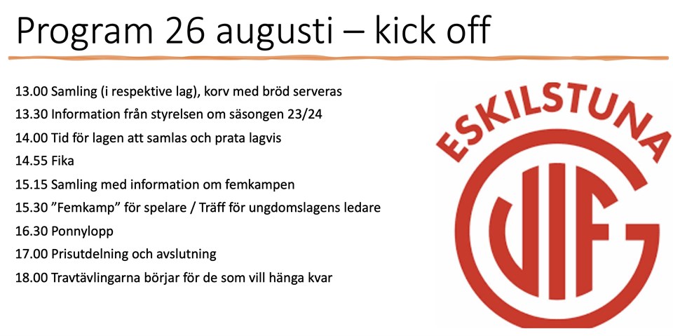 Program för vår förenings Kick-Off på lördag! 13.00 Samling (i respektive lag), korv med bröd serveras 13.30 Information från styrelsen om säsongen 23/24 14.00 Tid för lagen att samlas och prata lagvis 14.55 Fika 15.15 Samling med information om femkampen 15.30 ”Femkamp” för spelare / Träff för ungdomslagens ledare 16.30 Ponnylopp 17.00 Prisutdelning och avslutning 18.00 Travtävlingarna börjar för de som vill hänga kvar Adress: Sundbyholmstravet, Sundbyholm https://www.sundbyholm.com/infor-besoket/besokare/hitta-hit/ OBS: Ta gärna röda overall tröjan så Guif syns extra bra! Det går mycket bra för föräldrar att följa med. Vid samlingstiden för lagen (mellan 14-15) så får lagen egna platser med bord och stolar. Lagen disponerar denna tid. Några frågor att diskutera kommer att vara föreningsgemensamma Eventuella allergier anmäls till respektive ledare. Delar av aktiviteten är ute. Tänk på det när det gäller kläder. Vi hoppas att så många som möjligt kommer i/har med röd träningsoverallsjacka. Femkampsgrenarna är av skoj/samarbetskaraktär. Vi se på lördag Välkomna! Eskilstuna GUIF IF
