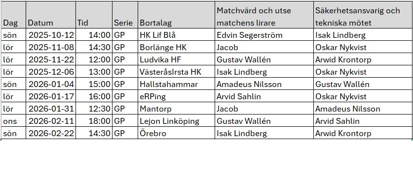Nu finns en lista på arbetsuppgifter i samband med GP's hemmamatcher i division 2. (P19-matcherna är inte med i denna lista, de matcherna hanterar vi separat) Var och en ansvarar själv för att byta om man har förhinder. Arbetsuppgifter: Tekniska mötet hålls 1 h innan matchstart i första ”logen” närmast kiosken. Med på Tekniska mötet är säkerhetsansvarig/arrangemangsansvarig och matchvärden. Arrangemangsansvarig håller i själva mötet. En separat lista finns med det som mer exakt ska tas upp och vem som gör vad. (ligger under Dokument\Arbetsuppgifter) Kort kan man säga att följande uppdrag är: Tekniska mötet – Arrangemangsansvarig, håller i tekniska mötet. Säkerhetsansvarig – Ansvarar för säkerheten (hjärtstartare, bår mm) Matchvärd – Hjälper till att visa var motståndarlaget har sitt omklädningsrum (prata med vaktmästaren eller våra tränare). Se till att en god ton hålls på läktaren. Matchens lirare – ansvarar för att utse matchens lirare, en i varje lag. Funktionärerna ska vara på plats vid spelarnas samlingstid. Finns upplagt under Dokument/Arbetsuppgifter/Funktionärer GP hemmamatcher 2025-2026.pdf Länk: Funktionärer GP hemmamatcher HK GP/Herrar J 7 okt 8kommentarer