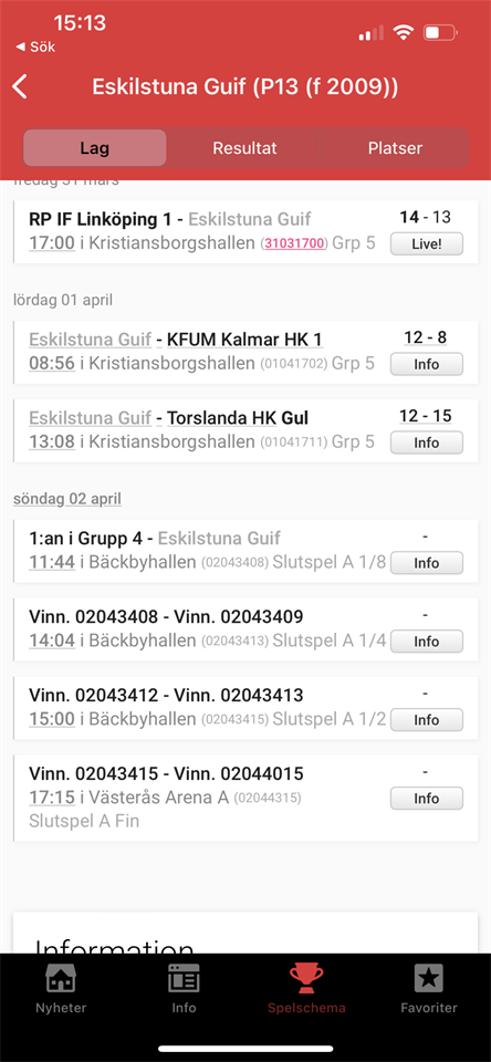 Hej. Snart Dax för spel i Katrineholm, lottningen ser ut som följande: Det är tre grupper med fyra lag i varje grupp. Vi spelar i Grupp 2: Järnvägen(gul), Haninge(vit) och Täby (röd) Lördag 15/4 (Samling kl 09:00 i Duveholmshallen) 10:00 Järnvägen-Guif Duveholmshallen C 14:00 Guif-Haninge Nya Järvenhallen 18:40 Täby-Guif Duveholmshallen C Matcher spelas 2x15min Lunch: Lördag ingår i deltagarkortet(pasta m köttfärsås, matsalen ligger vid Duveholmshallen)deltagarkortet är digitalt via en app som Janne skrev nedan. Söndag 16/4 A- eller B-slutspel. Ta med både Röd och Svart tröja, överdagskläder att ha på mellan matcher, massor med energi påfyllnad då det blir en lång dag på Lördag. Positivt humör och massor av pepp!!! Mvh