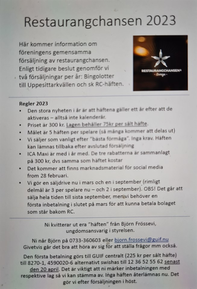 Hej Idag drar vi igång försäljningen av RC-häften i vårt lag, Vi har väntat lite mot övriga lag i Guif med tanke på att vi drog igång den "egna" försäljningen av pasta. Försäljning av RC-häften är en av de två årliga försäljnignarna som alla lag gör. Se också det dokument som följer med denna nyhet som en bild. Albin har med sig kuvert med tre "häften" (det är inte egentligen häften - utan koder till app) till varje spelare ikväll och vi säljer efter bästa förmåga fram till mitten på april. Om ni undrar över något - hör av er till Björn, 0733-360603 alt bjorn.frossevi@guif.nu. Mvh // Björn P-2009 25 mar 2023 0kommentarer