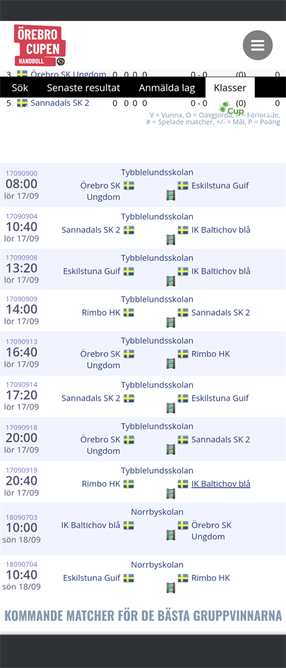 Hejsan alla! Våran första match är redan kl08:00. Incheckning i skolan är från kl 09:00 Plats Tybblelundskolan "tybblelundsvägen 3" Där äter vi frukost på söndag mellan 6:45-09:00 Lunch och middag äter vi på Ambyskolan Lunch 11-14:00 (lördag o söndag) (Middag 17-20:30 bara lördag) Vi spelar i grupp D 08:00 Örebro sk 13:20 Ik Baltichov blå 17:20 Sannaskolans sk 2 Söndag Norrbyskolan 10:40 Rimbo HK Slutspel 12:40 13:20