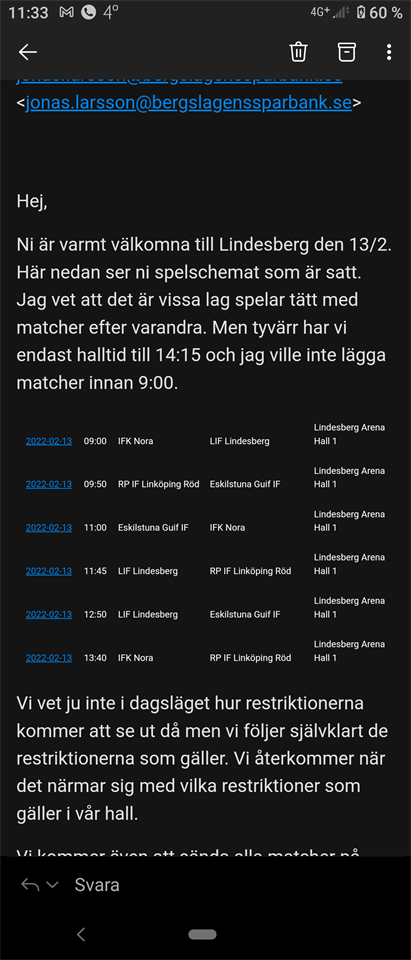 För att vi alla ska kunna fortsätta spela handboll utan striktare restriktioner så krävs det att smittspridningen av Covid-19 hålls nere och det måste vi alla hjälpas åt med. Här kommer lite att tänka på inför match och träning. Träningar * Alla med symptom stannar hemma! * Dela inte vattenflaska. Matcher * Alla med symptom stannar hemma! * Dela inte vattenflaska. * Max en vuxen/spelande barn i hallen. * Ingen kiosk. * 2 Coronavärdar/Matchvärdar (iklädda gula västar) på läktaren som hälsar motståndare välkomna och talar om att vi har sittande publik med 1 meter mellan sällskapen samt håller koll på antalet i publiken. Det är upp till varje enskilt lag att avgöra om det behövs fler värdar. * Spelare och ledare får inte vara på läktaren. * Max 50 personer i publiken. * Ingen onödig tid i korridor/hallen, lagen får hålla sig i omklädningsrummen. // Eskilstuna Guif P-2009 13 jan 2022 12kommentarer