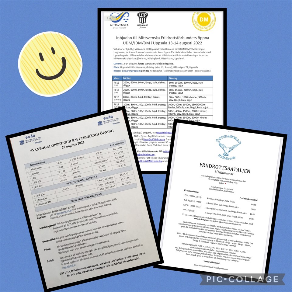 Hej! Hoppas ni har det bra i sommarvärmen! 😊 Här kommer lite tips på två tävlingar som vänder sig för barn födda 2016/2017 och äldre. Lör 20/8 är det Friidrottsbataljonen i Östhammar En mångkamp som vänder sig för de som är födda 2016-2010) Se mer info på Osthammarfriidrott.se (där finns även anmälningslänken) det brukar vara en mysig tävling! Som vi kan rekommendera! Anmäl Senast 8/8. Lör 27/8 Svanbergaloppet (även Roslagsmästerskap) i Svanberga som vi själva anordnar. Vi firar även 90 år jubileum denna dag! Anmälan görs på www.easyrecord.se senast 22/8. OBS: 50kr per barn och 100kr per vuxen kostar det för alla, även för oss i Estuna IF, betalning sker samtidigt som ni anmäler, det går att anmäla på plats en timme innan start för respektive grupp med en dubbel avgift. Medalj och kexchoklad till alla. Fina priser i vuxenklassen. Ett schema över alla aktiviteter som sker denna dag kommer senare i augusti, som tex musikunderhållning, ansiktsmålning, maskotar, sponsorer visar upp sig, årshjul med bilder/text på vad vi i föreningen har gjort sedan starten -1932, innebandy skoj i hallen, friidrottskoj på fotbollsplan, Norrtälje tidning kommer och gör en livesändning där vi berättar vår historia plus mkt mer. Ha en fortsatt fin sommar! 😊