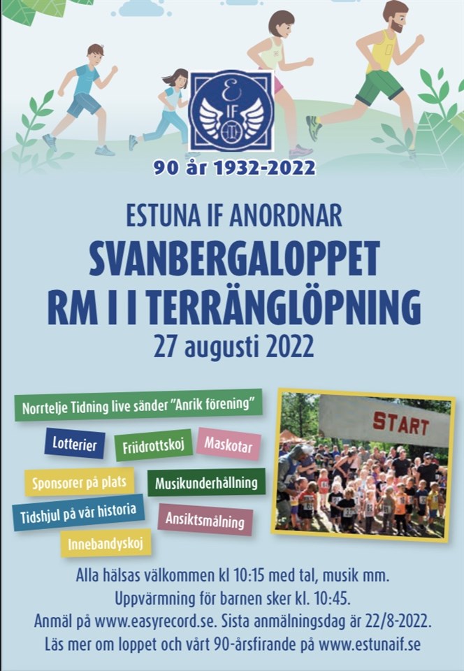 Hej och välkomna till Svanbergaloppet/RM och Estuna IF´s 90-årsfirande! En sommar ligger framför oss men den 27 augusti kommer vi att genomföra vårt traditionsenliga löplopp men också samtidigt passa på att fira Estuna IF som fyller 90 år. I bilagan finner ni den information ni behöver för att anmäla er till Svanbergaloppet. För att delta i vårt 90-årsfirande krävs ingen anmälan – bara kom, dela vår glädje och ta del av det vi har att erbjuda! Den 25 augusti kommer vi att presentera dagsschemat över dagens alla aktiviteter. Estuna IF hoppas att vi ses den 27 augusti! Har ni frågor är ni välkomna att kontakta Martin Gyrulf 0709-446468 Varmt välkomna!