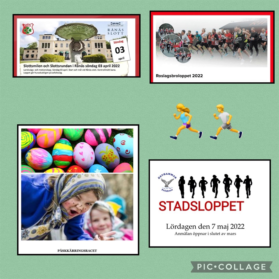 Hej! Äntligen vår i luften och dags för springlopp! 😊🏃? Här kommer reklam om några springlopp som anordnas nu under våren. Söndag den 3/4 är det slottsmilen i Rånäs som Rånäs 4H anordnar, sista anmälningsdag är 28/3. Klicka här för mer info och anmälan: Slottsmilen Rånäs4H Söndag den 10/4 är det Roslagsbroloppet. Klicka här för mer info och anmälan: Roslagsbroloppet -22 I Roslagsbroloppet vet vi flera som kommer delta ifrån Estuna IF. Lördag 7/5 är det Stadsloppet i Östhammar. (Anmälan har inte öppnat än) Stadsloppet Östhammar Rånäs 4H, Roslagsbro IF och Östhammars Friidrott skickar fakturan på anmälningsavgiften i efterhand till oss på de som deltar ifrån Estuna IF på dessa lopp. OBS detta gäller bara för våra medlemmar i Estuna IF och anmäl er bara om ni vet att ni kommer delta. Ta gärna på er era EIF tröjor när ni springer. Stort Lycka till! 😊 --------------------------------------- Sen kommer Östhammars friidrott anordna ett lopp på långfredagen den 15/4 som kallas för Påskkärringracet i Östhammar som vi vill också göra reklam för. Mer info och anmälan hittar ni på Östhammars friidrotts facebookgrupp. Ett trevligt lopp för barn mellan 3-12 år där flera även klär ut sig och springer. För detta springlopp betalar ni själva om ni vill delta, samtidigt som ni gör er anmälan. Begränsat antal platser så anmäl er i god tid, redan idag 165 st barn anmälda! 😊