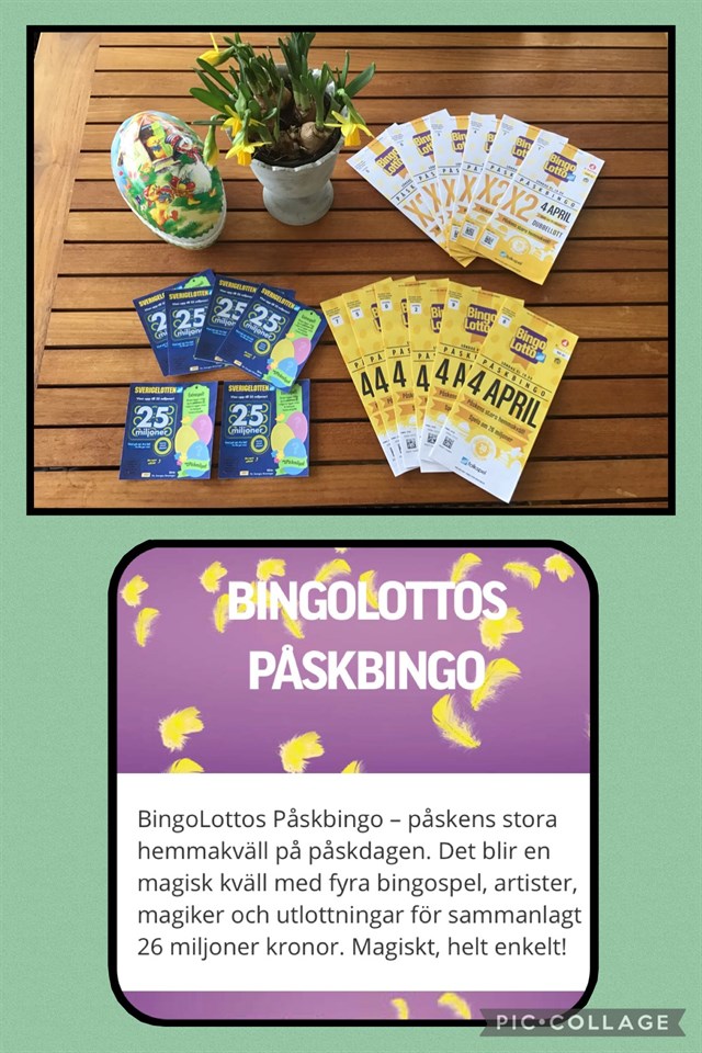 Bingolotter / Sverigelotten Vi har precis fått hem Bingolotter och Sverigelotten till påskhelgen (söndagen den 4/4 kl 18,00) för er som är sugna på att köpa/sälja och stödja oss i Estuna IF. Påskhelgen är Bingolottos nästa största spelhelg efter uppesittarkvällen vid jul. I år kommer det vara 26 miljoner i potten och en kväll fylld med artister och underhållning! Priser: Enkellott 50kr Dubbellott 100kr Sverigelotten 25kr (en skraplott liknande triss) Vill man beställa så skriv här nedanför i kommentarsfältet på laget.se eller sms tel 0705-324782 (Anna) så tar vi med redan färdigpackade kuvert till nästa träning. Estuna IF Swish: 123 561 1298 Klubbrabatten I slutet på Mars får vi även hem nya klubbrabatten Roslagen som vi kommer sälja även i år den kommer kosta 200kr mer info om detta kommer framöver när det är dags!
