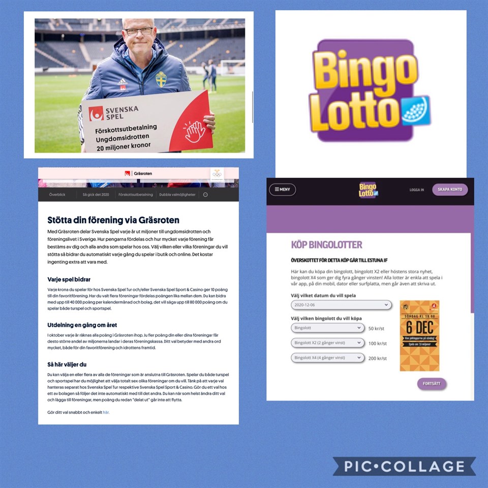 God fortsättning på det nya året! 😊 Hoppas ni haft en härlig julledighet! Som ni säkert vet om så kommer vi tyvärr inte kunna ha några gemensamma träningar fram till och med den 24 januari enligt de riktlinjer som gäller nu i Stockholms län. Vi återkommer så fort vi vet mer när vi kan dra igång vår barngymnastik igen! Hoppas det inte är allt för långt fram! ------------- Här nedan kommer lite reklam om Gräsroten och Bingolotto som ni gärna får sprida och tipsa era nära och kära med: Bingolotter: Intresset för Bingolotter har ökat sista åren och nu till uppesittarkvällen slog vi i föreningen rekord med antalet sålda lotter. Jättekul! Så vi vill även göra reklam för att man kan stödja oss i föreningen året om genom att prenumerera så man får dessa lotter direkt till brevlådan eller att köpa digitala bingolotter, som man smidigt kan spela på på en IPad eller skriva ut. Så tipsa gärna era släktingar om det! Uppge Estuna IF om ni ringer till Folkspel tel 0771-440 440 och vill starta en prenumeration. Eller Klicka här om ni vill beställa digitala lotter: Beställ Bingolotter här Gräsroten Svenska Spel och Gräsroten fördelar över 42 miljoner kronor till ungdomsidrotten och föreningslivet i Sverige varje år. Det fina är att du kan vara med och bestämma vilka föreningar som ska få del av pengarna då du tex spelar på svenska spel. Det kostar ingenting att vara med. Så uppge gärna oss som förening då du spelar/köper lotter av Svenska Spel. Man kan välja upp till tre föreningar som man stödjer. Du som valt förening/-ar i Gräsroten får automatiskt en avisering via e-post när årets fördelning är färdig.