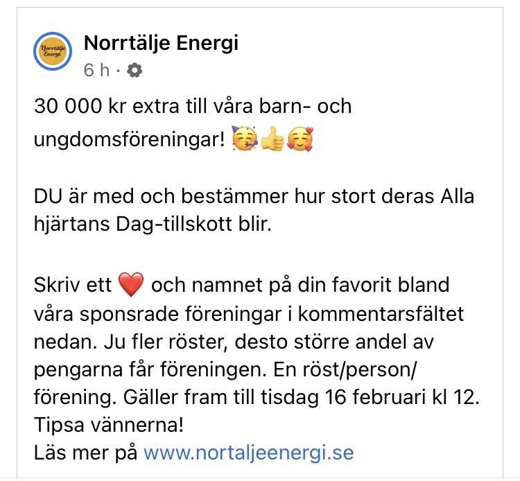 Lite info till alla grupper: Sportringen: Vi håller just nu på att se över vårt klädsortiment på vår EIF webshop på Sportringen. Så vänta med att beställa kläder därifrån tills vi har lagt in vår nya kollektion där. Vi meddelar här på sidan när vi är klara med det! Medlemsavgifter: Vi skickade ut medlemsavgiften via laget.se till alla i slutet på januari, har ni inte fått någon så hör av er till vår kassör: Estunaif.kassor@gmail.com eller tel: 070-9446468 Den kan ha kommit i eran skräppost, ibland skickas den bara till ena föräldern, så kolla om den andra föräldern kan ha fått den. Norrtälje Energi: Vår sponsor Norrtälje Energi ger 30 000 kr extra att dela på till barn- och ungdomsföreningar till Alla hjärtans dag. Det enda du behöver göra är att kommentera Norrtälje Energis inlägg på facebook med ett hjärta och skriva Estuna IF. Ju fler röster, desto större andel av pengarna får föreningen! Så in på Norrtälje Energis inlägg på facebook och ge Estuna IF ett hjärta! Idrottsgalan ikväll: Ni missar väl inte Norrtälje idrottsgala nu på fredag den 12/2-21 kl 20-21,30 som livesänds via Norrtälje Tidning. Där Norrtälje kommuns idrottsliv ska hyllas och vi bla kommer kunna se våran egen representant Martin Gyrulf ifrån Estuna IF ta emot ett barn och ungdomsstipendium på 10 000kr till föreningen ifrån Norrtälje Kommun, kultur och fritidsnämnden.