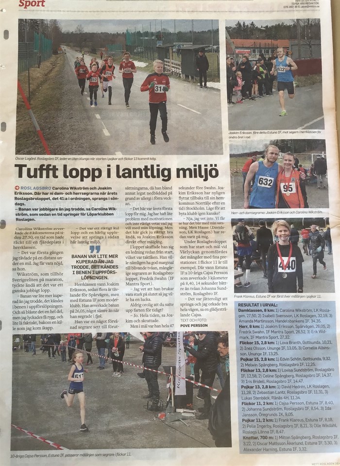 I tidningen ”Mitt Roslagen” som delades ut till alla hushåll den 16/4-2019 så står det om Roslagsbroloppet som var i söndags och några av våra deltagare finns med i reportaget både på bild och text! 😃 Se bild, ovanför! Det står även om Joakim Eriksson född -92 som återigen tog hem segern i herrklassen, han har Estuna IF som moderklubb och har haft Åke Nordberg som tränare under många år sedan han var liten. Nu springer han för Spårvägen.
