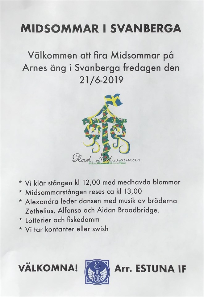 Hej alla EIF medlemmar och Svanbergabor! Snart en månad kvar till midsommar och vårt planerande är i full gång. För att vi ska kunna fortsätta med vårt trevliga traditionsenliga midsommarfirande i Svanberga behövs det många fler som kan hjälpa till med detta. Det brukar komma uppskattningsvis 300 st varav 100 st är barn till Arnes äng och fira med oss. Firandet startar kl 12,00 med att klä stången och dansen till levande musik kl 13,00 på Arnes äng i Svanberga. Om du/ni känner att ni kan bidra på något vis såsom hjälpa till med den tekniska biten, resa stången, konferencier, koppla högtalare, sälja lotter, hjälpa till med fiskedamm osv. (Levande musik och dansledare har vi redan ordnat.) Så hör gärna av er senast den 26/5 till: Anna tel 0705-324782 eller Martin tel 070-9446468 Vi kommer ha ett planeringsmöte i början på Juni om vi har fler som kan hjälpa till med detta annars måste vi tyvärr ställa in det. Med vänlig hälsning Estuna IF