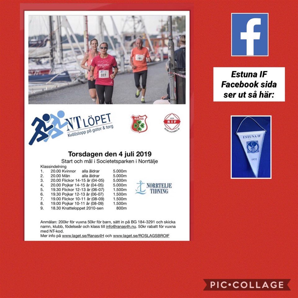 Såhär som på den lilla bilden ser Estuna IF s profilbild ut på Facebook. Några har hört av sig att den är svår att hitta då det finns fler sidor inom föreningen men den vi tipsar om och som är aktuell är denna, där kommer vi bla lägga ut info om allt möjligt som ska hända eller har hänt i föreningen och info om skidspåret mm. Vi har precis fått upp en fin tavla vid elljusspåret i Svanberga som visar de olika sträckorna som finns. Många kanske inte vet om det men det är vi i föreningen och framförallt vår egen Matte Eriksson som sköter om spåret helt ideellt sommartid som vintertid. (Inte kommunen som många tror) Vad hade vi gjort utan honom!? Lördag den 24/8 kommer vi själva att anordna Svanbergaloppet vid elljusspåret i Svanberga. Det är ett populärt springlopp som passar alla från små till stora i alla åldrar. (Även kallad Roslagsmästerskap för vuxna) Mer info om detta kommer snart! 😃 Sugen på att springa redan nu?! Då är det snart dags för NT löpet i Norrtälje är torsdag den 4/7 (samtidigt som julinatta) start och mål är i Socitetsparken. Mer info om de olika sträckorna finns här: NT-Löpet 4/7 Vill man delta så anmäl er senast söndag 30/6 till Mail: Akerlund_anna@hotmail.com eller tel 0705-324782. Då behöver vi veta vilken klass man vill delta i, så anmäler vi Estuna IF och betalar startavgiften för alla våra medlemmar i föreningen. Alla efteranmälningar sker på plats och då betalar man avgiften själv. Redan nu är några anmälda ifrån Estuna IF som ska springa Knatteklassen och vuxenklassen. 😃
