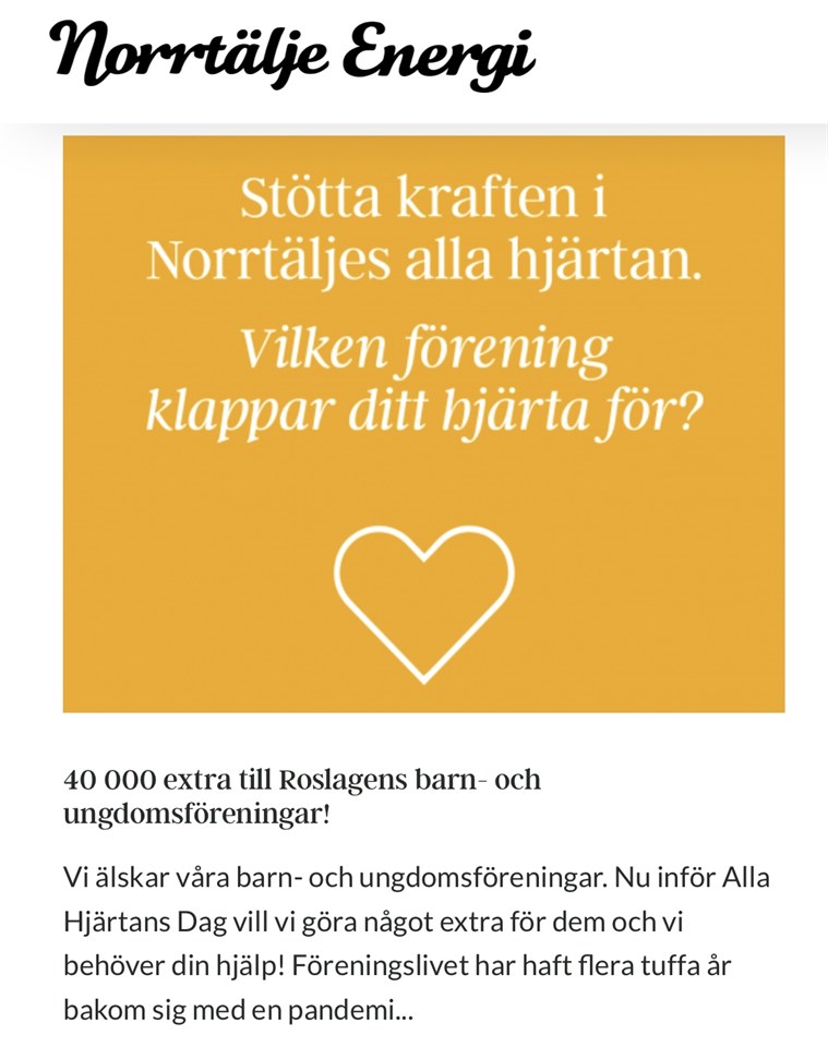 Hej! Vår sponsor Norrtälje Energi har ännu en ny överraskning! Nu inför alla hjärtans dag så delar de ut 40 000kr till sina sponsrade föreningar! 😊 De har taggat alla föreningar som de är sponsorer till på ett inlägg på sin Facebook-sida, där vi vill att så många som möjligt ska gå in och lägga sitt hjärta på just vår förening (Estuna IF) och ju fler hjärtan vi får desto större blir vår pott av de 40 000kr som de kommer dela ut. 😊 Kampanjen pågår t.o.m. torsdag 16 februari kl 12.00 Så gå gärna in på Norrtälje Energis inlägg på facebook och skriv ett Hjärta och Estuna IF (Obs det är bara på Norrtälje energis egna inlägg som de räknas på! ) Tack för ert stöd!! 💙💙 IB Ungdom motion 10 feb 2023 0kommentarer
