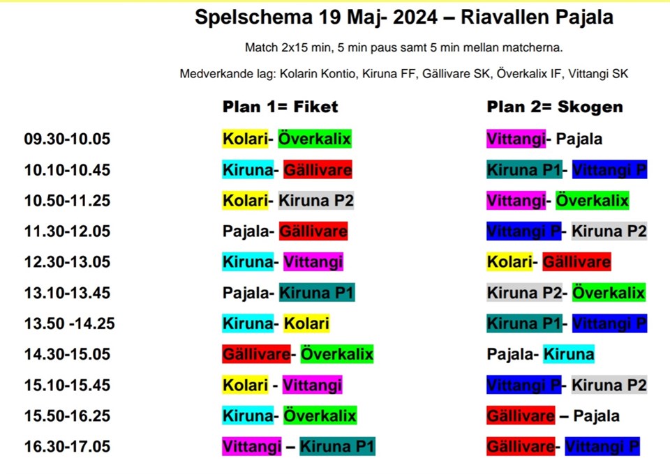 Imorgon blir det arbetspass och matcher i massor! Hoppas ni har laddat bra med mat och vätska! Här kommer även spelschemat! Glöm inte att sprida till nära och kära att komma förbi på Riavallen och heja fika och äta hamburgare!